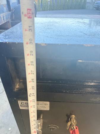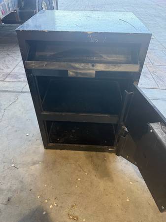 Two key entry doors with a cash drop slot for the top door. Designed to go under a counter at a business and can be bolted to the floor for security. Comes with a couple sets of keys just not needed...
