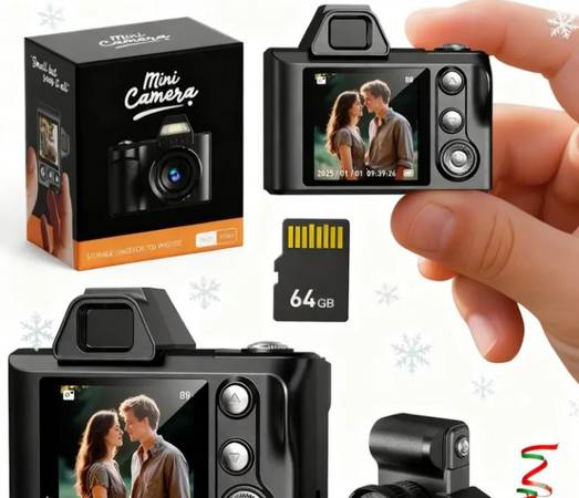 Brand new still in box. Mini 1080P 2 MP digital camera. Has a 1 in LCD high definition screen. Rechargeable battery. Can take pictures and videos. Comes with a 64GB memory card. This little guy takes amazing quality pictures for its size. Comes with charging cable, lanyard and 64GB memory card.