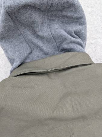 This vintage Dickies men’s work jacket is constructed from durable green canvas and features a quilted interior lining for added warmth and insulation. A standout detail is the cotton hood with an attached hoodie-style insert, designed to look like a sweatshirt sewn into the jacket near the zipper. This inner hoodie layer is partially covered by the outer canvas placket with snap buttons, offering extra protection from wind and cold while adding a unique layered look.