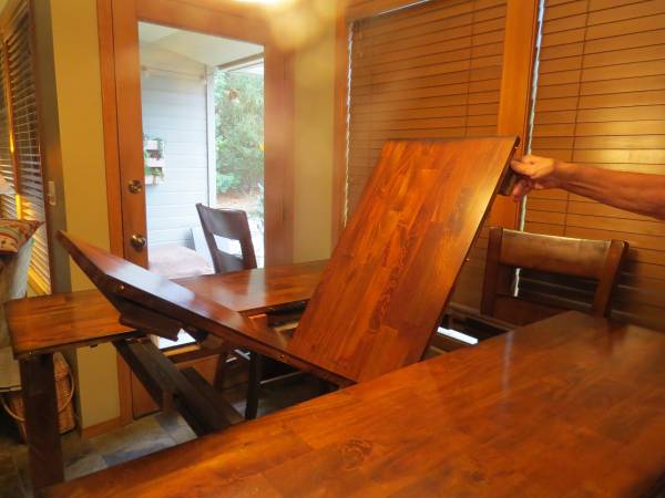 The table has a self storing butterfly extension leaf that is easy to open. When opened the extension leaf adds 18 inches more to he length of the table.