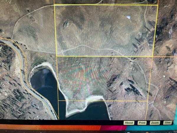 Picture 12: This is a arial view of the property from the access road in the middle of the picture that goes horizontally from left to right across the picture. My property is from the dirt access road south to the lake and includes some of the lake. You can see the property line from the difference in the color of the grass. The dry grass in on my property.