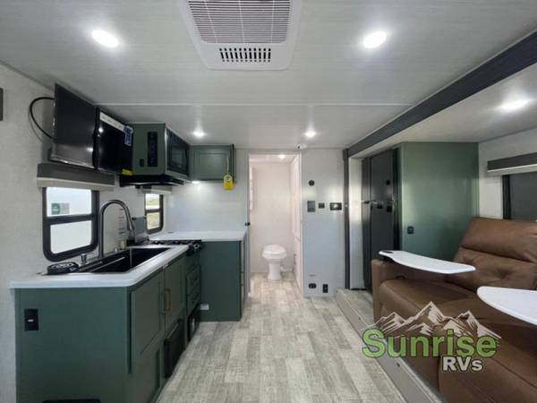 This spacious trailer is perfect for weekend trips to the lake! Once you're set up at camp, put out the patio awning, make lunch on the outside kitchen, and grab your camp chairs from the slam latch cargo doors with pass-thru lighting. A jackknife sofa slide inside will provide more space and a place to relax in the evenings, and a full bath means you won't have to use the camp's facilities. The kitchen includes an all-in-one microwave and air fryer, plus a refrigerator and overhead cabinets for food storage. When it's time to call it a night, the front queen bed is sure to bring comfort!