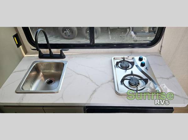 You're sure to make memories at the campground in this travel trailer! The little ones or your guests can claim the bunk beds to themselves, while you take the walk-around RV queen bed up front. There are dual nightstands here plus an overhead cabinet to keep your things out of the way. Once dinner has been made on the cooktop, you can dine at the booth dinette or take your plate outdoors to sit under the 12' power awning. This unit also incudes a private bath with a shower and toilet, with the sink just outside the room so two people can freshen up at once!