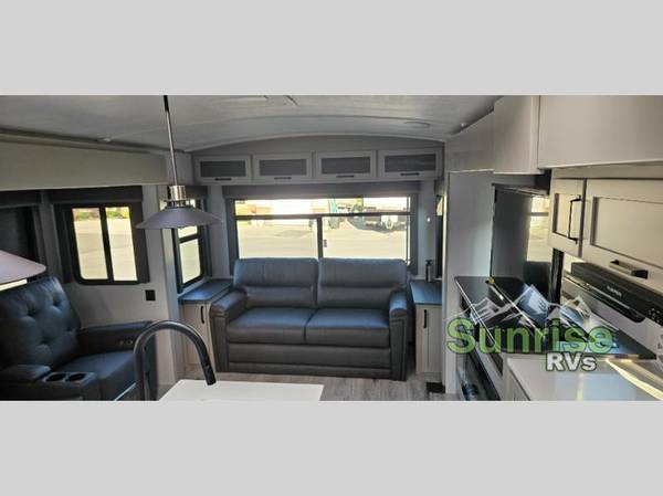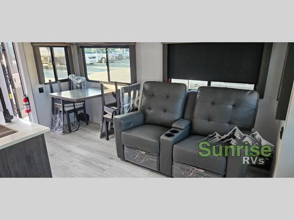 Whether you camp for inside comforts or outside adventures, this trailer will provide the comfort once you step inside. The rear living area has a sofa sleeper for guests, three slides throughout for maximum floor space, and a 10 cu. ft. 12V GE refrigerator. There is a 50" HDTV and fireplace to enjoy, theater seats, and a booth dinette, or you can choose a table and chairs option in its place. The full bathroom will let you freshen up each night, and the bedroom offers a king bed, front wardrobe, washer/dryer prep, and more storage.